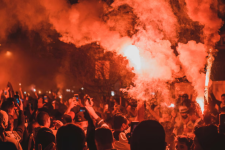 The image of the fiery demonstration that the officers seem to float above in the composite shared by the Oregon Republican party turned out to be another image from the free archive site Pexels. It was taken by a Brazilian photographer in 2017.