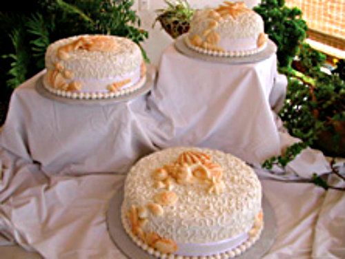 Thank you :) You must have a very good palette. If I remember, this cake was a 4-layer carrot cake with alternating caramel cream and cream cheese frostings in the middle....rolled fondant on the outside (the little balls at the base were marzipan) and the shells were white chocolate with edible luster dust for the coloring :)