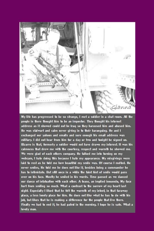 Of course I melted. He never smiles, He told me he does not like it, besides being a commander he has to intimidate. But still once in a while the faint hint of smile would pass over on his face. Mostly he smiled in his words. Time passed as we danced our dance of infatuation with each other. A tease, an implied innuendo, My face hurt from smiling so much. What a contrast to the sorrow of my heart last night. Especially I liked that he felt the warmth of my intent, in that faraway place, a less lonely place for him. He does not like what he has to do with his job, but likes that he is making a difference for the people that live there. Finally we had to end it, he had patrol in the morning. I hope he is safe. What a lovely man.